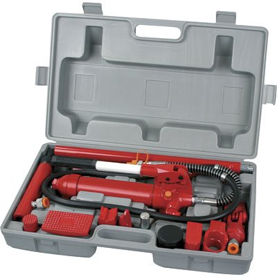 Torin Jack Porta Power with Carry Case - 4 Ton Heavy-duty auto body, frame repair and construction hydraulic equipment in one compact carry case. Snap lock design for fast and easy assembly. Automatic pump overload system prevents ram and equipment damage. Durable heavy walled extension tubes for long service life. Flex head features permanently molded interlocked rubber pad to prevent separation. Long handles for low pumping effort. 4-13/16inch ram stroke, 4-3/4inch minimum lift and 13inch maximum lift. Carry case includes: 27inch, 19-1/2inch, 15-1/2inch, 8-1/2inch and 3inch extension tubes; male connector; wedge head; serrated saddle; flat base; ram toe; plunger toe; rubber head; 90 combination head and spreader.